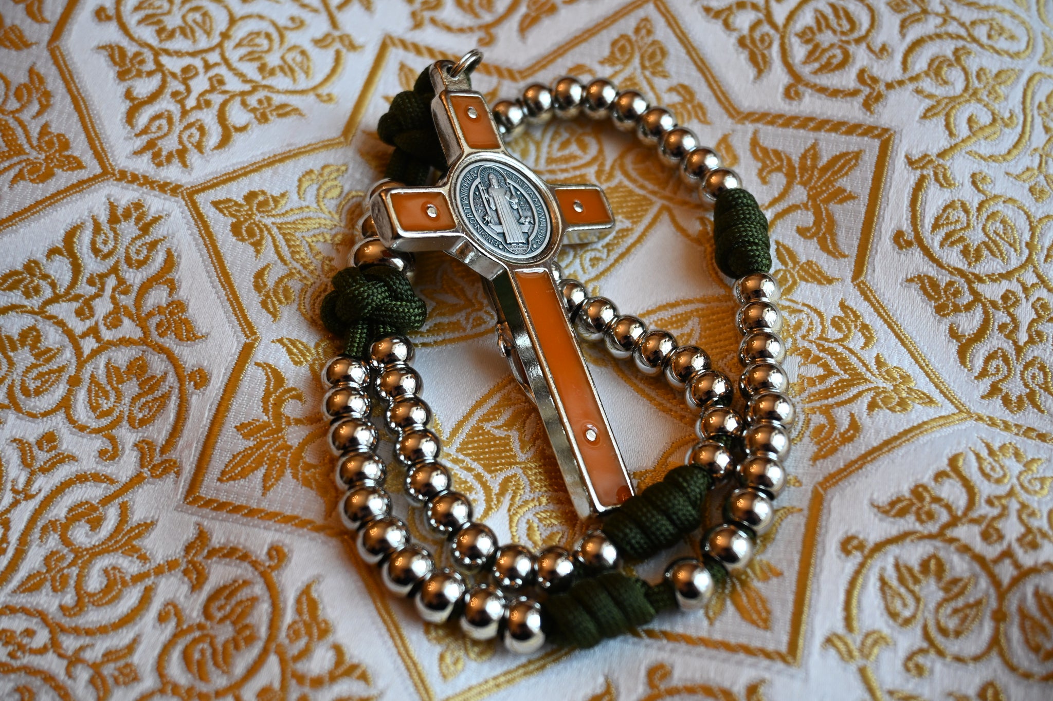 This rosary is made with forest green paracord; the same grade of paracord that NASA and the US Military use!
