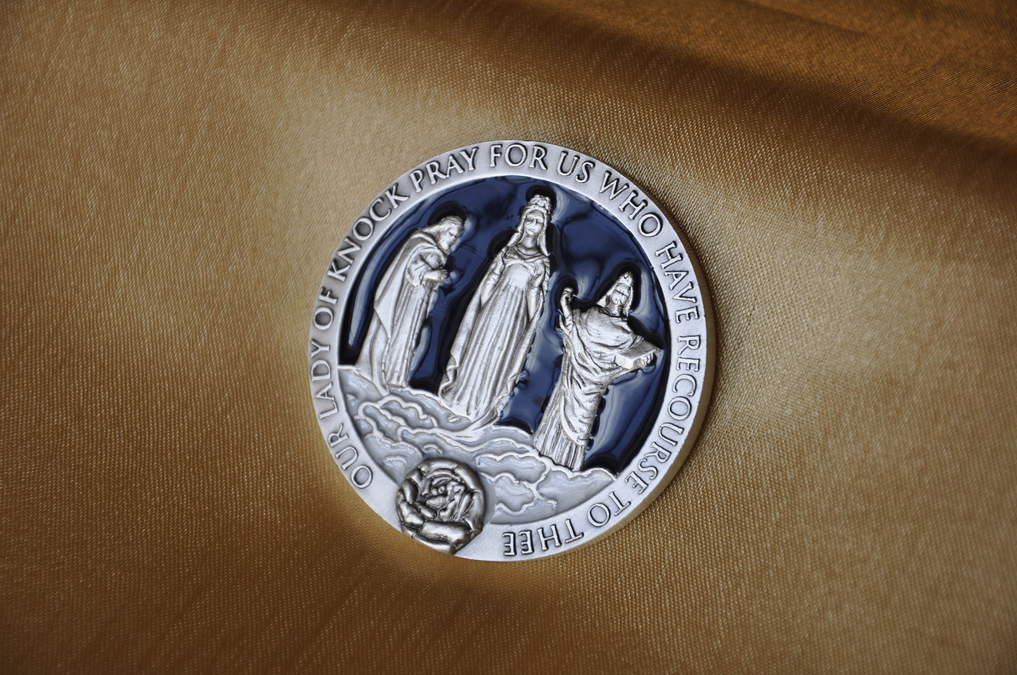 DESIGN: Handcrafted by Italian artisans who have perfected their trade over nearly a century, this medal is 60mm in diameter and is made of solid brass in silver tone with dark blue and white pearl enameling.  On the one side are depicted the Lamb, altar and cross, all of which surrounded by a myriad of adoring angels.  The Latin text of the Mass ‘Angus Dei qui tollis peccata mundi, miserere nobis’ (Lamb of God, Who takes away the sins of the world, have mercy on us) is inscribed around the edge along with the Cenacle Press logo of the chalice and cross at the bottom.  On the reverse side is an image of the apparition itself surrounded by an inscription of the invocation ‘Our Lady of Knock, pray for us who have recourse to thee’ and a motif of the golden rose below.